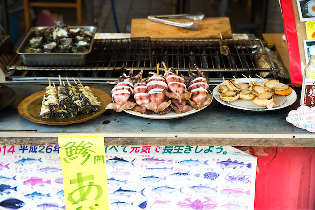 海産物の網焼きを売ってる店がたくさんあります。