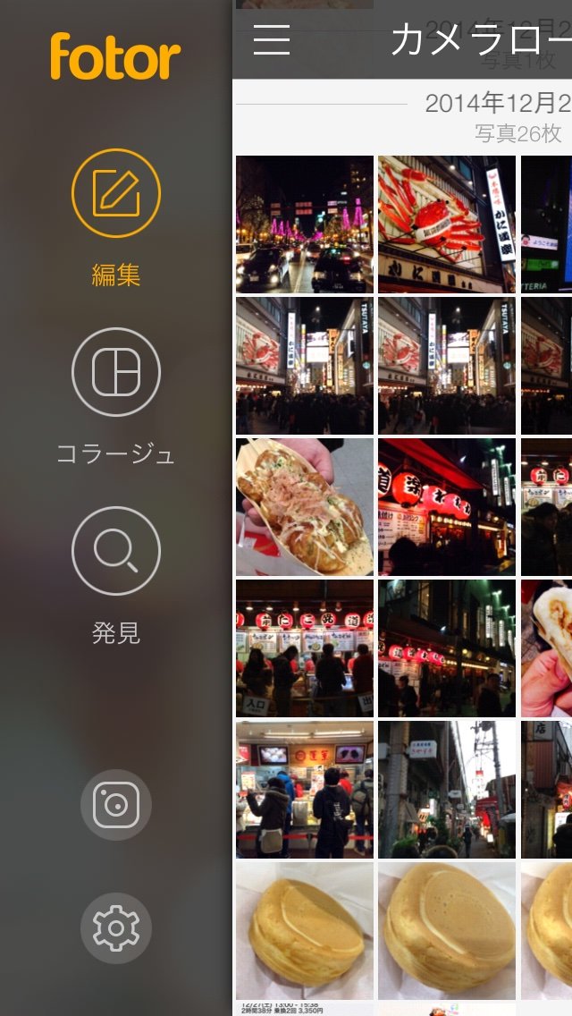 アプリを起動すると、「編集」「コラージュ」「発見」という選択肢が出てきます。