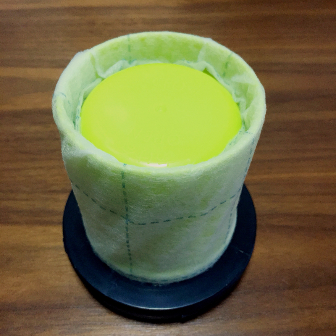 そんなわけで、Amazonのレビューにあったように、100円ショップでエアコンフィルターなどの不織布を買ってきて、中間フィルターに貼り付けました。